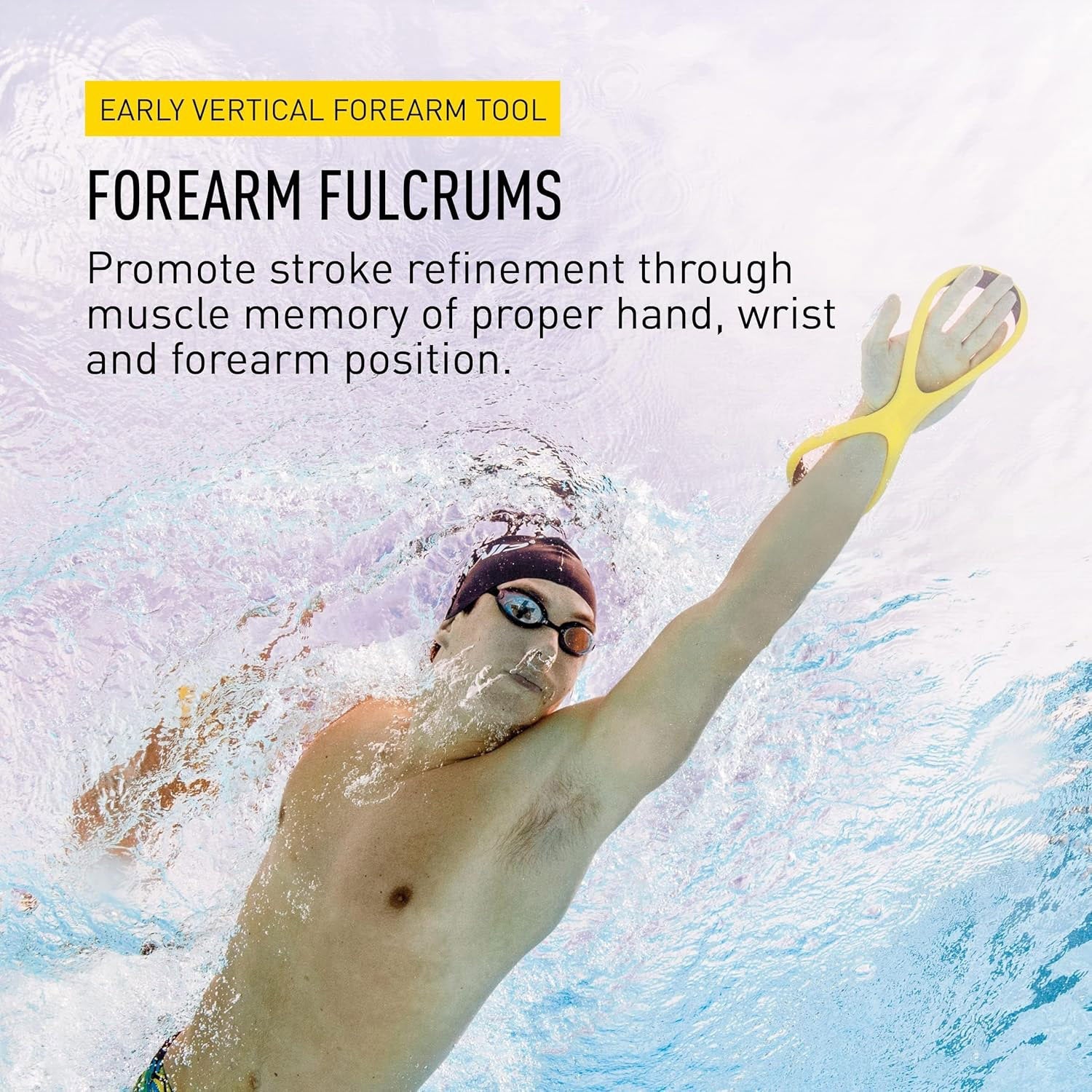 The forearm paddle helps form an early vertical forearm (EVF) position, improving stroke efficiency by engaging the entire forearm, from fingertips to elbow, during swimming.