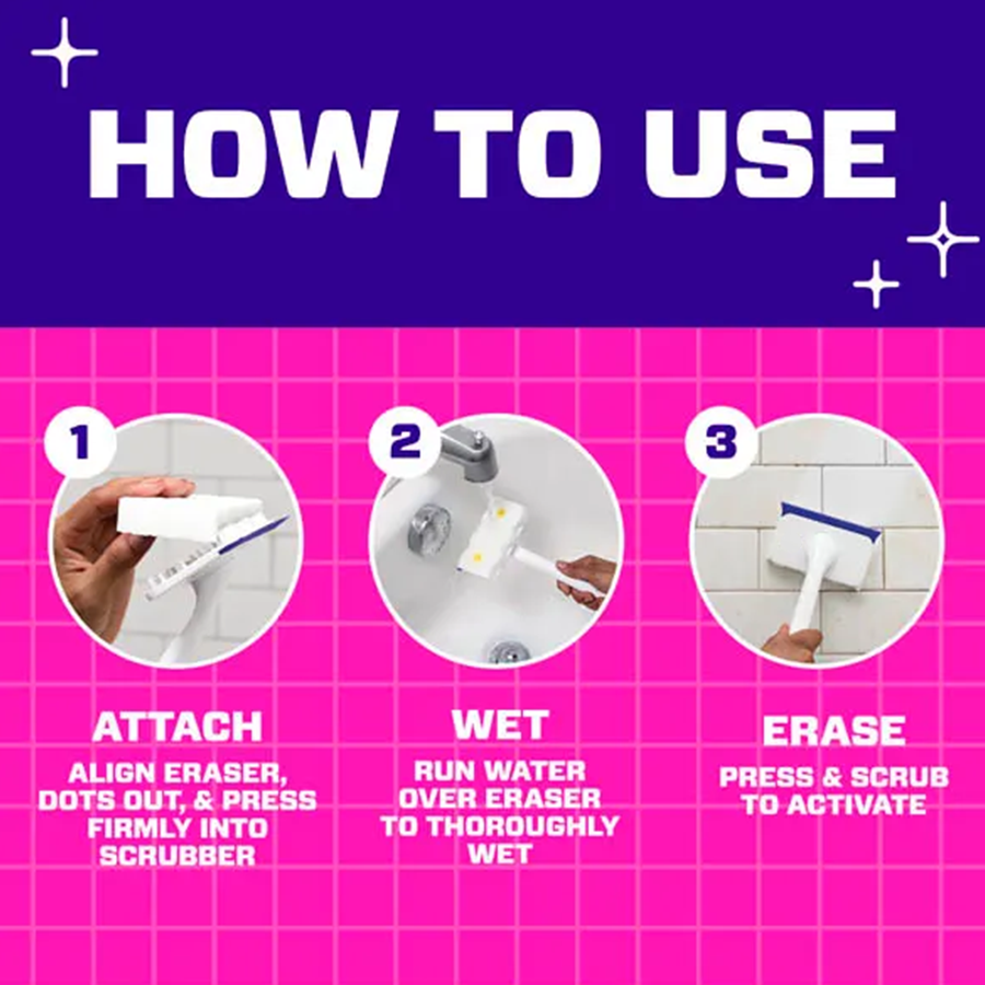 All-in-one eraser scrubber designed to clean surfaces efficiently with easy activation and storage.