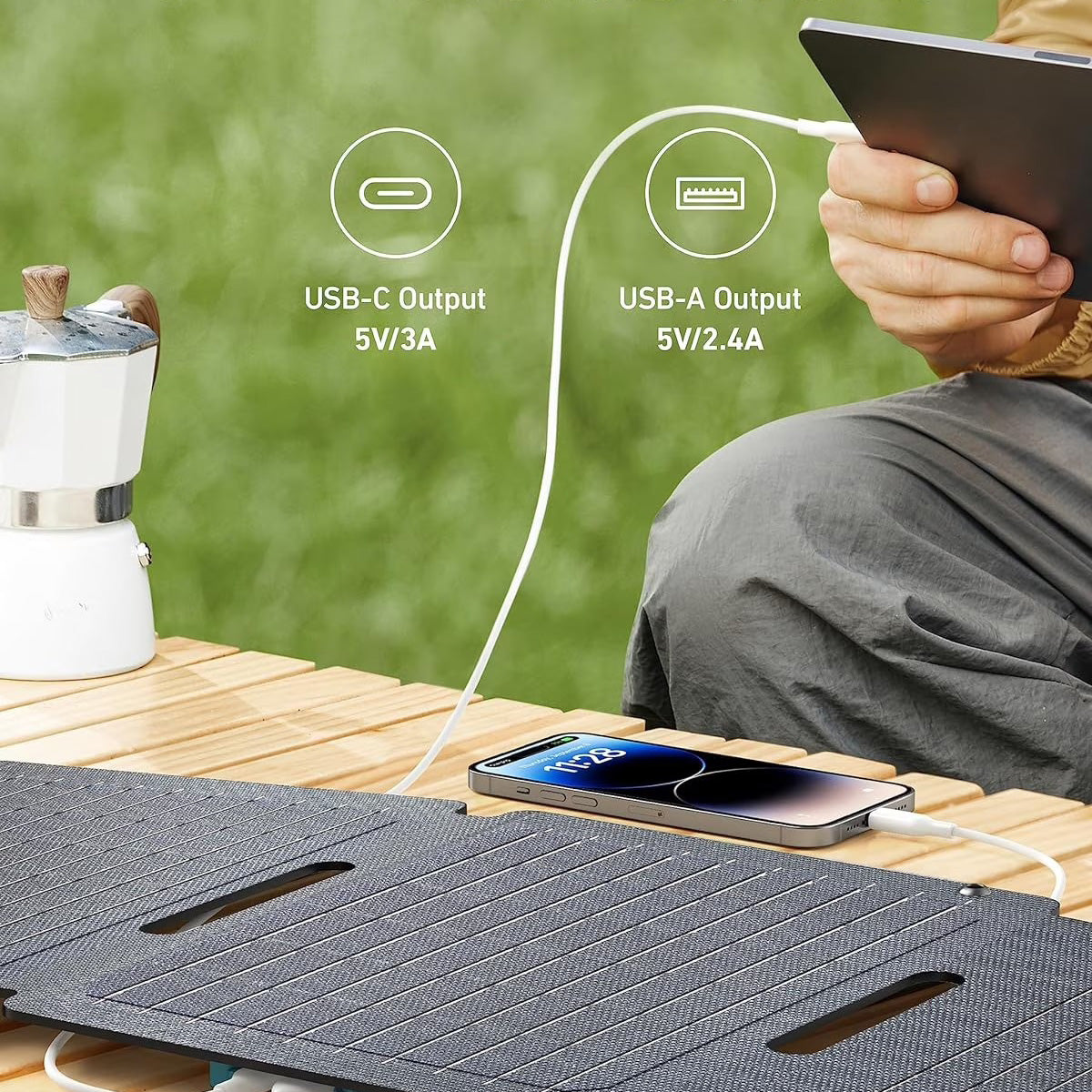 Harness the sun's energy for reliable charging anywhere—30W solar power with USB-A and USB-C ports for smartphones, tablets, cameras, and more.