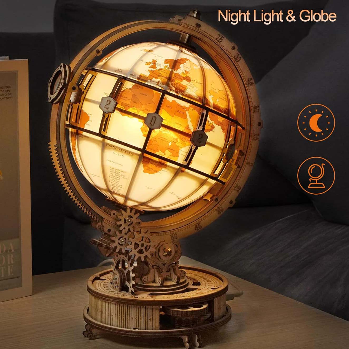 Build your own light-up globe with 180 pre-cut wooden pieces. Assemble, then light it up at night to watch the world glow—even in the dark.
