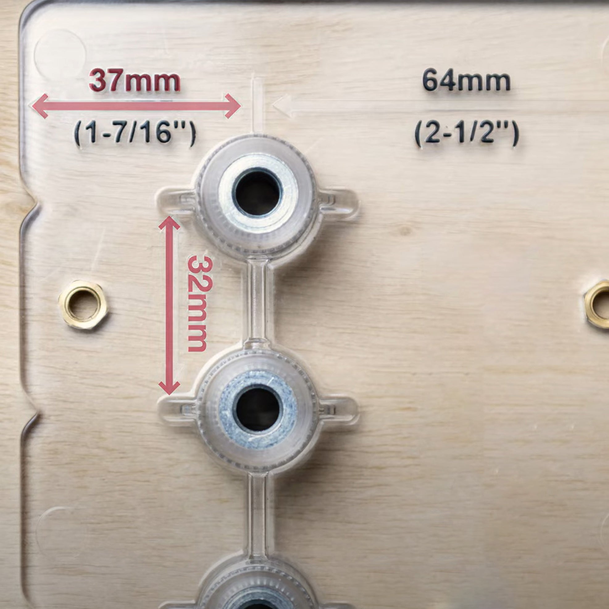 Standard 32mm hole spacing; repositionable stop block allows for 37mm or 64mm setback distance — removable for access to cabinet case backs.