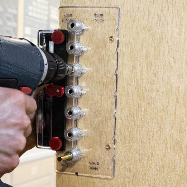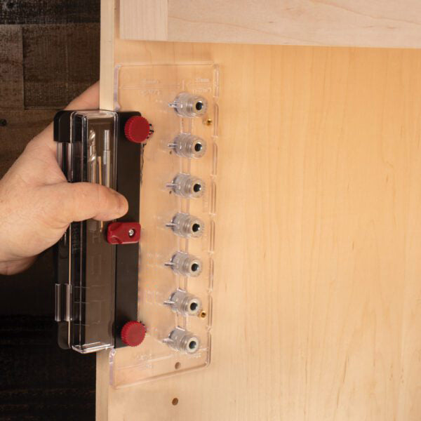 A transparent drilling jig designed to position and drill perfect shelf pin holes — allowing up to 7 holes per setup with a built-in centering slot for easy alignment and repositioning.