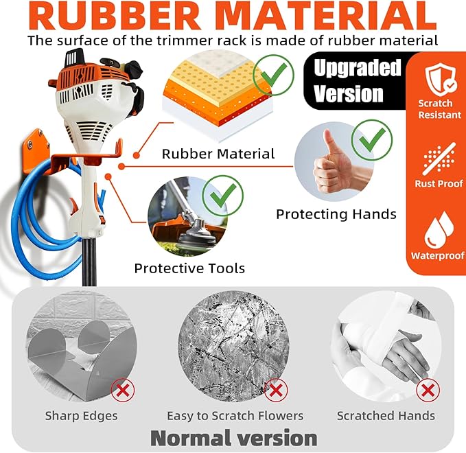 Keep your trimmer and garden tools organized and off the ground with this heavy-duty wall-mounted rack set. Made from robust steel with a protective rubber coating, it securely holds weed eaters, hedge trimmers, and other long-handled tools. Easy to install on various surfaces, it’s a simple and effective storage solution for garages, sheds, workshops, and trailers.
