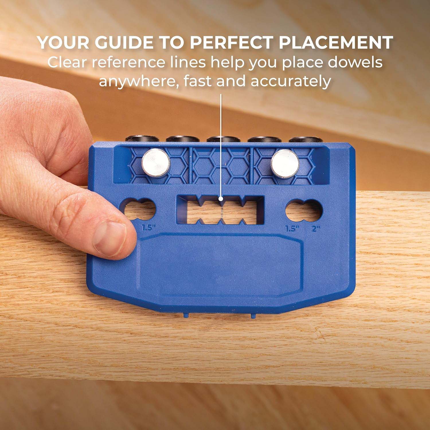 Built-in centering ensures accurate dowel placement. Hardened steel drill guides create repeatable, straight holes every time.