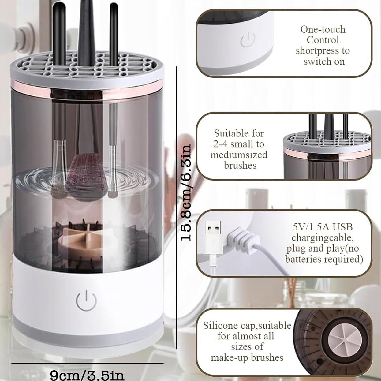 Compatible with a wide range of makeup brushes—from small eyeshadow brushes to large powder brushes—no need for multiple cleaners or accessories.