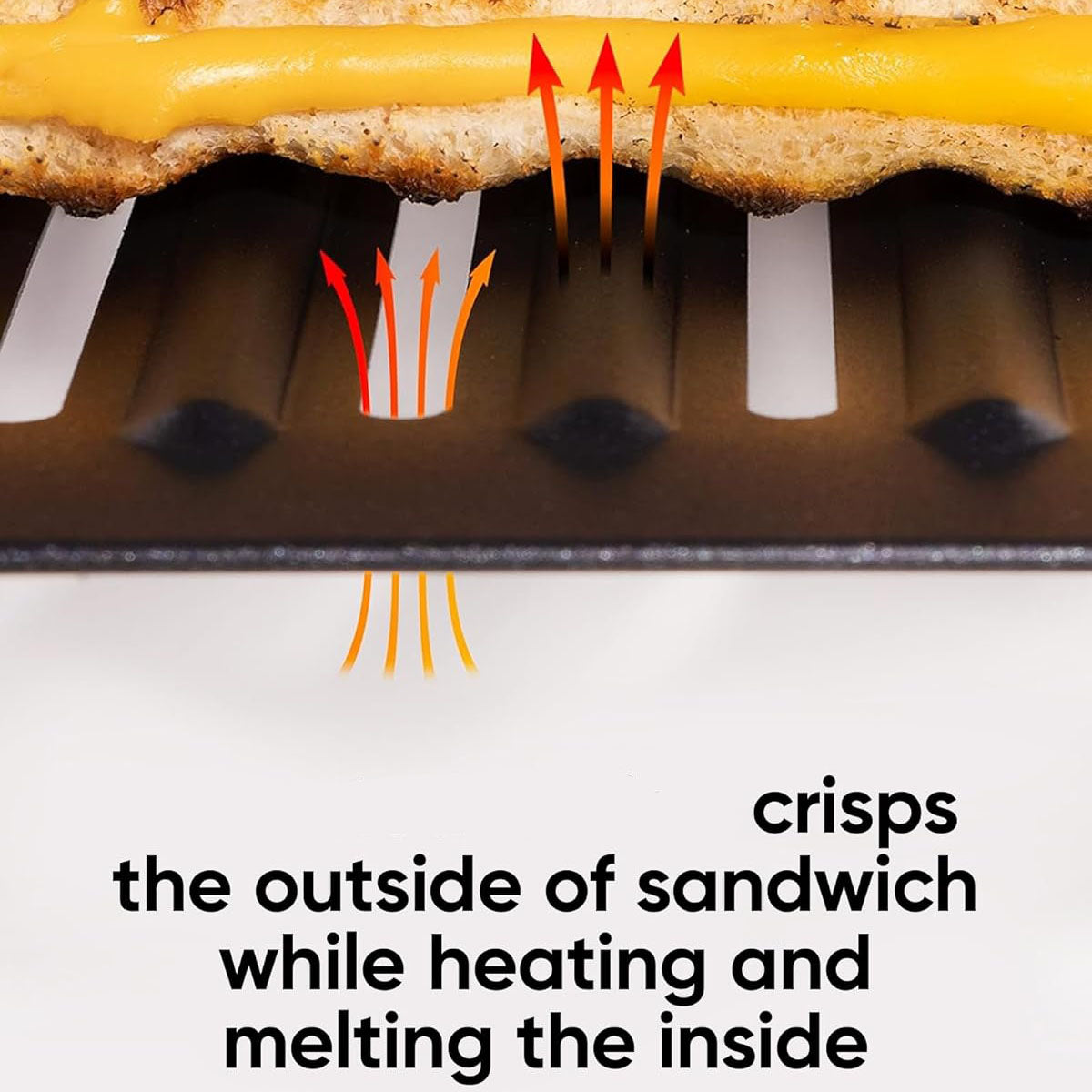 Uses conductive heat to crisp the outside and melt the inside for flawless toast and sandwiches.