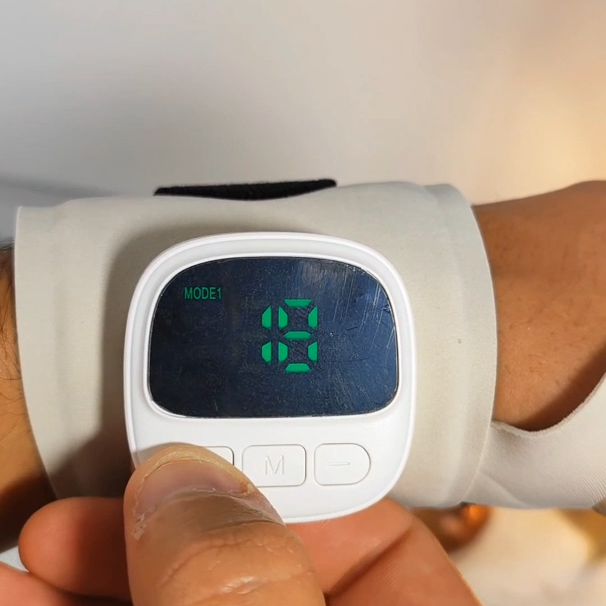EMS electrotherapy system transmits gentle electrical impulses to soothe aching wrists and relieve stiffness quickly.