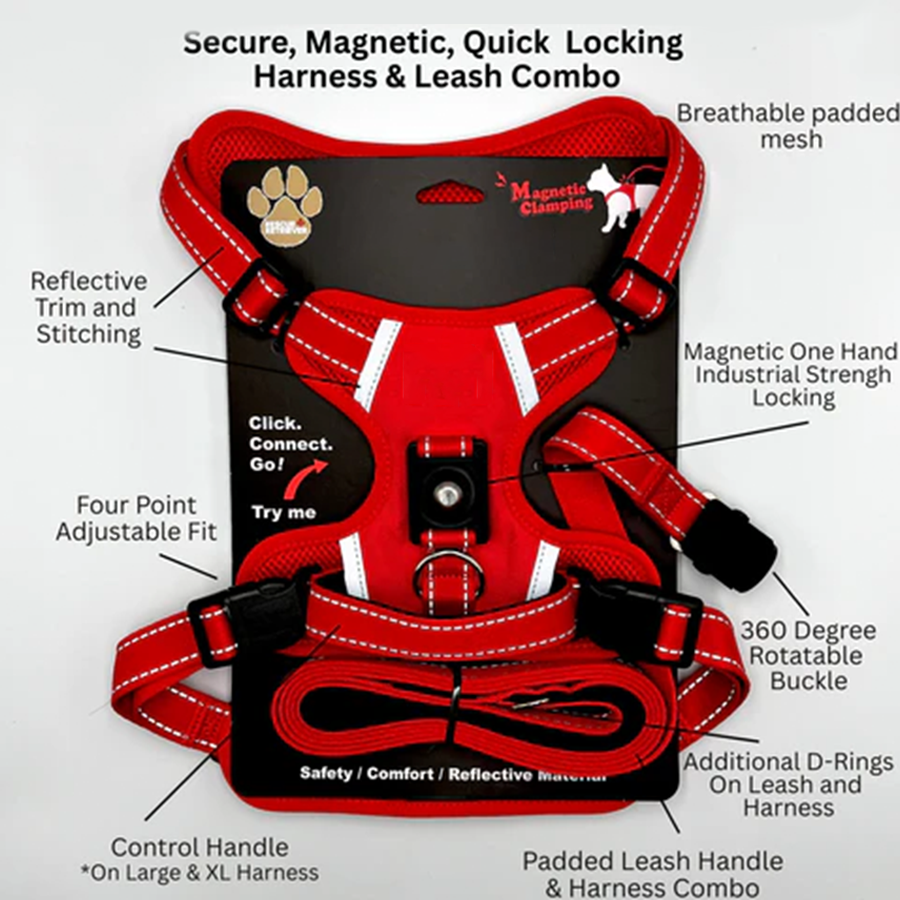 The magnetic dog harness and leash allows quick, secure one-handed locking for safer dog walks.