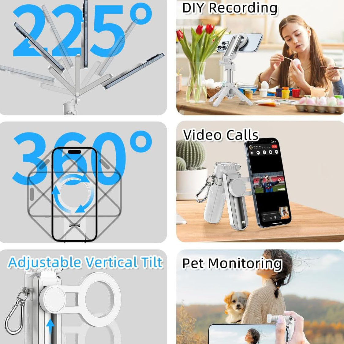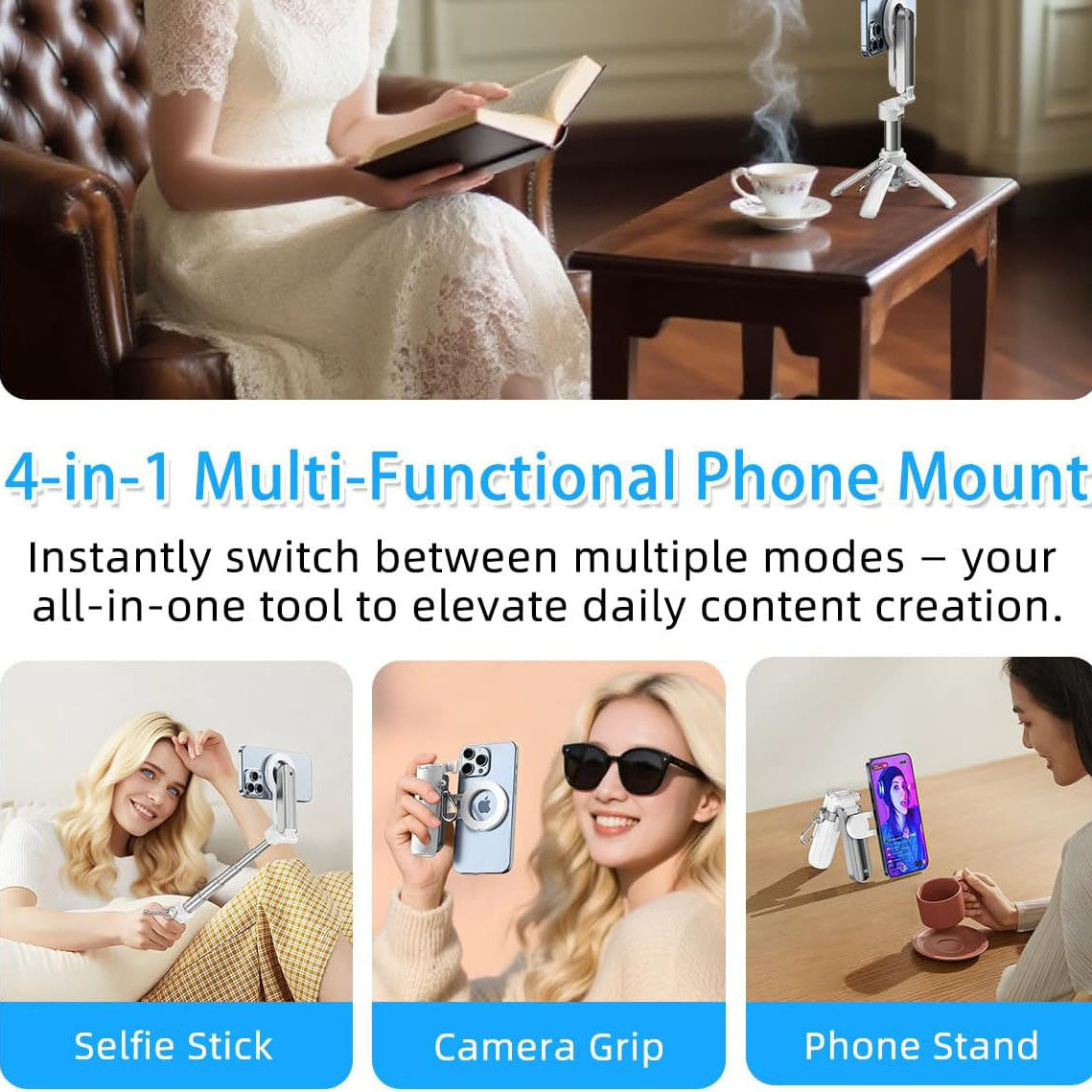 Not just a phone stand, this device can transform into a selfie stick, handheld camera grip, mini tripod, and desktop phone holder in seconds. Perfect for daily photography, remote work, video conferences, vlogs, or group photos. One tool, endless possibilities.