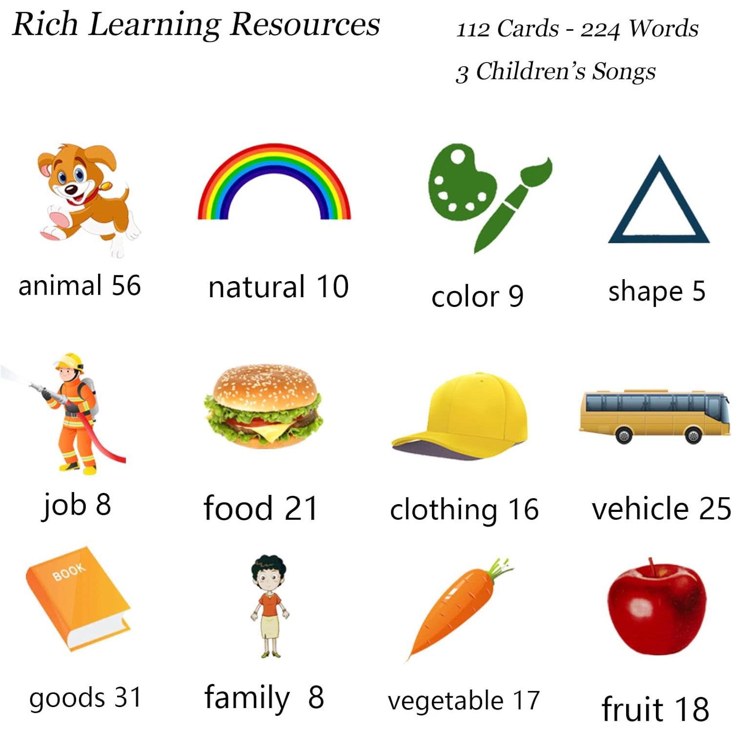 Insert, hear, learn—words come alive! ✨ This interactive set includes 112 double-sided cards (224 sight words) covering shapes, colors, animals, food, and more. Just insert a card—it reads the word and plays realistic animal or vehicle sounds. Includes 3 children's songs. Perfect for speech therapy, autism sensory learning, and reducing screen time. USB rechargeable. Toddlers love it!
