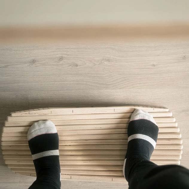 Wooden balance board designed to improve posture and core strength while standing or working.